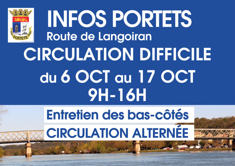 Les travaux préparatoires au chantier de rénovation de la RD1113 commenceront dès lundi 10 octobre. La lettre jointe est en train d'être distribuée à l'ensemble de la population. Pour en savoir plus rendez-vous le vendredi 28 octobre 2022 pour une réunion publique d'information à l'Espace Culturel La Forge à 19h. Merci de vous inscrire via le coupon réponse de la lettre ou en téléphonant à la mairie : 05 56 67 17 75 - également par mail : contact@mairie-de-portets.fr.